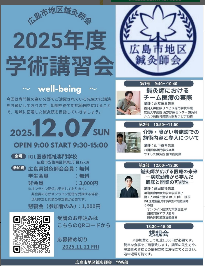 「広島地区鍼灸師会学術集会にて当センターの鍼灸師永友佑夏先生が「鍼灸師におけるチーム医療と実際」について講演を行います。お申し込みをお待ちしております。